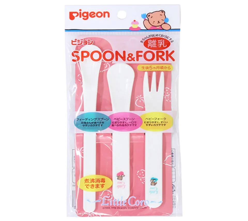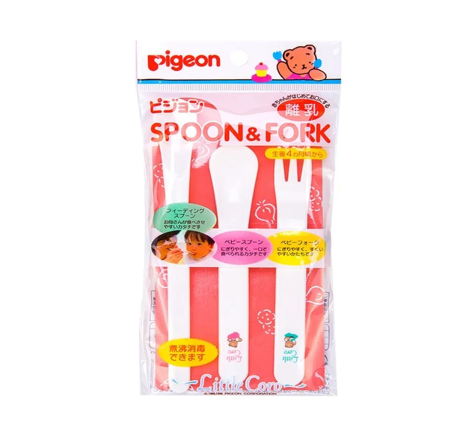 - Bộ thìa nĩa Pigeon bao gồm: 2 thìa (1 thìa ngắn dùng cho tập cho bé tự múc ăn + 1 thìa dài cho mẹ đút bé ăn) + 1 nĩa cho các bé tự ăn rau củ, thịt cá hoặc trái cây.