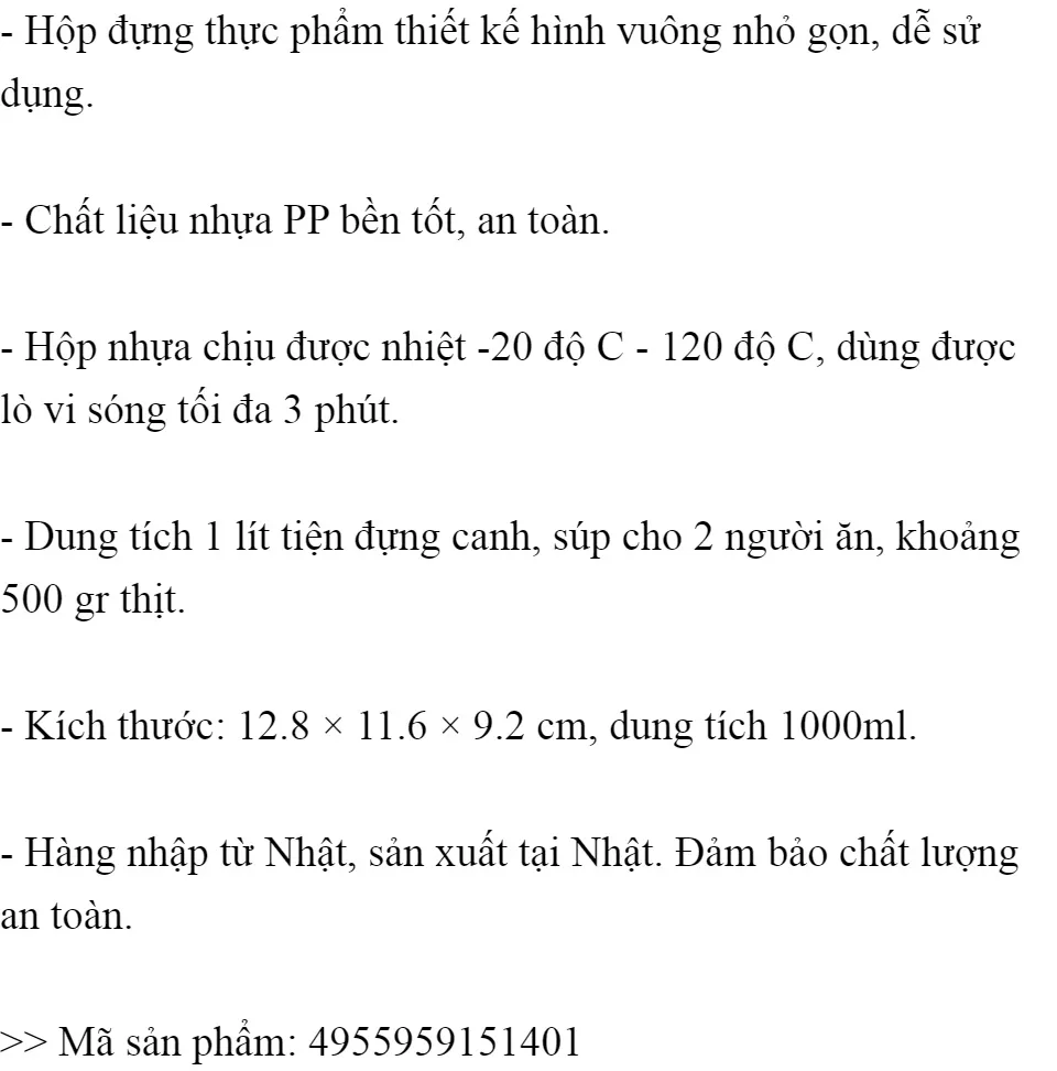 {"id":3672496,"name":"HỘP NHỰA ĐỰNG THỰC PHẨM WHITE PACK 1 LÍT - HÀNG NHẬT NỘI ĐỊA","desc":"","content":"<h2 style=\"margin-left:0px;\">Mô tả sản phẩm<\/h2><figure class=\"image\"><img src=\"https:\/\/img.lazcdn.com\/g\/shop\/eff0a47033e32c48392c005a94696df8.jpeg_2200x2200q80.jpg_.webp\"><\/figure><figure class=\"image\"><img src=\"https:\/\/img.lazcdn.com\/g\/shop\/c601aa1364f01f3cf98a3f4473db1f78.jpeg_2200x2200q80.jpg_.webp\"><\/figure><figure class=\"image\"><img src=\"https:\/\/img.lazcdn.com\/g\/shop\/2a2140487690b430172501055b16e996.jpeg_2200x2200q80.jpg_.webp\"><\/figure><figure class=\"image\"><img src=\"https:\/\/img.lazcdn.com\/g\/shop\/a9792826584f4e72b3b06bbf6656803e.jpeg_2200x2200q80.jpg_.webp\"><\/figure><figure class=\"image\"><img src=\"https:\/\/img.lazcdn.com\/g\/shop\/a65dd01b3b0080fc1f350d98aaa620c7.jpeg_2200x2200q80.jpg_.webp\"><\/figure><figure class=\"image\"><img src=\"https:\/\/img.lazcdn.com\/g\/shop\/1128eb2efea4beb3777c63f99fd9e4b0.jpeg_2200x2200q80.jpg_.webp\"><\/figure><figure class=\"image\"><img src=\"https:\/\/img.lazcdn.com\/g\/shop\/d905ddbd24e79c6dccab43427d1af95e.jpeg_2200x2200q80.jpg_.webp\"><\/figure><figure class=\"image\"><img src=\"https:\/\/img.lazcdn.com\/g\/shop\/e4e72bf2ad5e6ce451392cfbb99df034.jpeg_2200x2200q80.jpg_.webp\"><\/figure><figure class=\"image\"><img src=\"https:\/\/img.lazcdn.com\/g\/shop\/3d2436c53ada8db4d74f3bd3b446f137.jpeg_2200x2200q80.jpg_.webp\"><\/figure><figure class=\"image\"><img src=\"https:\/\/img.lazcdn.com\/g\/shop\/7f5ae7f2c47e2da139cb4a034a7c14e3.jpeg_2200x2200q80.jpg_.webp\"><\/figure>","image_url":"https:\/\/konni39thuduc.com\/datafiles\/89665\/upload\/images\/shopee\/2026-04-14\/a9cfb9b762ac82eebace35de8a2d2fb6.jpg?t=1776147714","image_thumb_url":"https:\/\/konni39thuduc.com\/datafiles\/89665\/upload\/thumb_images\/shopee\/2026-04-14\/a9cfb9b762ac82eebace35de8a2d2fb6.jpg?t=1776151978","tags":[],"count_view":2,"seo_name":"hop-nhua-dung-thuc-pham-white-pack-1-lit-hang-nhat-noi-dia","date_update":1776507223,"date_created_format":"","meta_title":"","meta_desc":"","meta_keyword":"","sku":"4955959151401","code":"4955959151401","rate":0,"image_2_url":"https:\/\/konni39thuduc.com\/datafiles\/89665\/upload\/images\/shopee\/2026-04-14\/356f55bfe71ce0ce8c7e3299ccd812ca.jpg","image_2_thumb_url":"https:\/\/konni39thuduc.com\/datafiles\/89665\/upload\/\/thumb_images\/shopee\/2026-04-14\/356f55bfe71ce0ce8c7e3299ccd812ca.jpg","time_promotion":false,"date_sale":[],"status_order":5,"variant_options":[],"variants":[{"status_inventory":1,"status_order":5,"id":891077,"product_id":3672496,"sku":"4955959151401","barcode":"","quantity":0,"quantity_alert":0,"price":49000,"price_discount":0,"images":[],"display_order":0,"is_point":"","point":"","vat":"","weight":"","variant_options":[],"variant_option_name":"","image":"","price_final":49000,"price_final_format":"49.000 đ","price_format":"49.000 đ","price_discount_format":"0 đ","percent_discount":0,"date_sale":[],"percent_discount_format":"- 0%","price_discount_final_format":"49.000 đ"}],"variantIdDefault":891077,"image_list":[{"image_url":"https:\/\/konni39thuduc.com\/datafiles\/89665\/upload\/images\/shopee\/2026-04-14\/a9cfb9b762ac82eebace35de8a2d2fb6.jpg","image_thumb_url":"https:\/\/konni39thuduc.com\/datafiles\/89665\/upload\/\/thumb_images\/shopee\/2026-04-14\/a9cfb9b762ac82eebace35de8a2d2fb6.jpg"},{"image_url":"https:\/\/konni39thuduc.com\/datafiles\/89665\/upload\/images\/shopee\/2026-04-14\/356f55bfe71ce0ce8c7e3299ccd812ca.jpg","image_thumb_url":"https:\/\/konni39thuduc.com\/datafiles\/89665\/upload\/\/thumb_images\/shopee\/2026-04-14\/356f55bfe71ce0ce8c7e3299ccd812ca.jpg"},{"image_url":"https:\/\/konni39thuduc.com\/datafiles\/89665\/upload\/images\/shopee\/2026-04-14\/6e945313538655f7dd1dc497616934f8.jpg","image_thumb_url":"https:\/\/konni39thuduc.com\/datafiles\/89665\/upload\/\/thumb_images\/shopee\/2026-04-14\/6e945313538655f7dd1dc497616934f8.jpg"},{"image_url":"https:\/\/konni39thuduc.com\/datafiles\/89665\/upload\/images\/shopee\/2026-04-14\/217f36c624835242b37ae6c156dd12f0.jpg","image_thumb_url":"https:\/\/konni39thuduc.com\/datafiles\/89665\/upload\/\/thumb_images\/shopee\/2026-04-14\/217f36c624835242b37ae6c156dd12f0.jpg"},{"image_url":"https:\/\/konni39thuduc.com\/datafiles\/89665\/upload\/images\/shopee\/2026-04-14\/faede5b8add7788f2ed749d641a72289.jpg","image_thumb_url":"https:\/\/konni39thuduc.com\/datafiles\/89665\/upload\/\/thumb_images\/shopee\/2026-04-14\/faede5b8add7788f2ed749d641a72289.jpg"},{"image_url":"https:\/\/konni39thuduc.com\/datafiles\/89665\/upload\/images\/shopee\/2026-04-14\/91eddf07f0991b4b77a7bb8a66ffca1f.jpg","image_thumb_url":"https:\/\/konni39thuduc.com\/datafiles\/89665\/upload\/\/thumb_images\/shopee\/2026-04-14\/91eddf07f0991b4b77a7bb8a66ffca1f.jpg"},{"image_url":"https:\/\/konni39thuduc.com\/datafiles\/89665\/upload\/images\/shopee\/2026-04-14\/6020a86b394fbe22f5e384560c1e664a.jpg","image_thumb_url":"https:\/\/konni39thuduc.com\/datafiles\/89665\/upload\/\/thumb_images\/shopee\/2026-04-14\/6020a86b394fbe22f5e384560c1e664a.jpg"}],"product_articles":[],"total_point_review":0,"link_youtube":"https:\/\/www.youtube.com\/embed\/","video_url":"","booking_url":"javascript:void(0)","file_url":"","config_panorama":[],"brand_name":"NoBrand","qr_code":"https:\/\/konni39thuduc.com\/hop-nhua-dung-thuc-pham-white-pack-1-lit-hang-nhat-noi-dia","promotion_name":"","status_inventory_value":1,"status_inventory":"Còn hàng","price":false,"price_final":"49.000 đ","percent_discount":false,"price_discount":false,"company_logo":"https:\/\/konni39thuduc.com\/datafiles\/89665\/upload\/files\/logo%20konni%20th%E1%BB%A7%20%C4%91%E1%BB%A9c.png","company_name":"KONNI39 THỦ ĐỨC","company_email":"konni39thuduc@gmail.com","company_phone":"","company_address":"","company_fax":"","date_now":1776514883,"company_tags":["HÀNG NHẬT \nKONNI 39\nKONNI39 THỦ ĐỨC"],"search_keyword":null,"facebook_comment":"https:\/\/konni39thuduc.com\/h