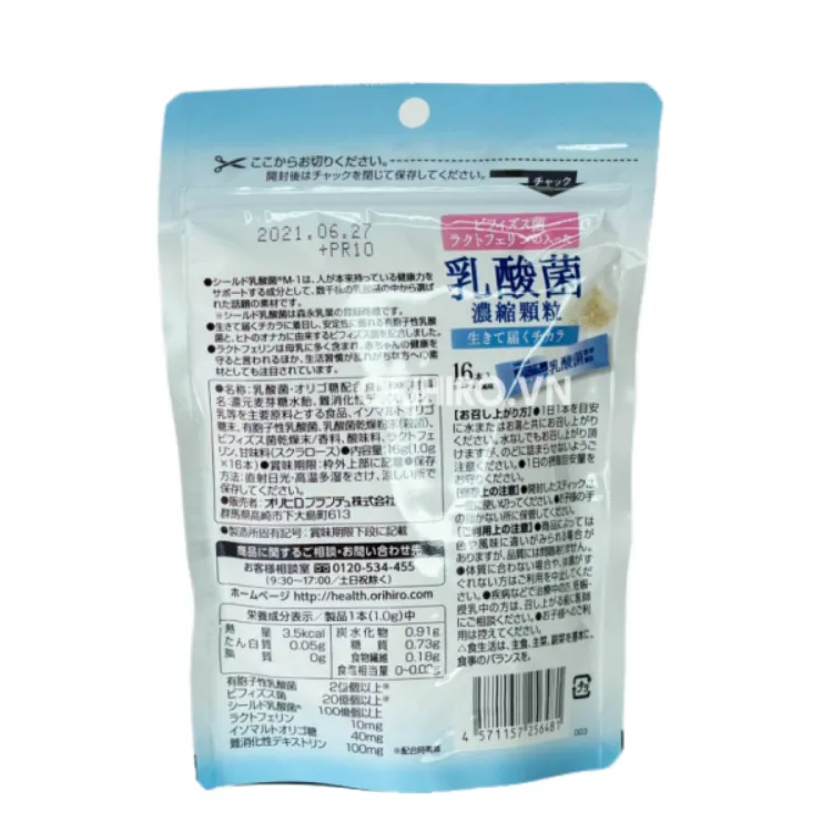- Cytoplasmic lactic acid bacteria – chủng vi khuẩn lactic có rất nhiều trong sữa chua – hỗ trợ rất tốt trong quá trình tạo môi trường đường ruột lành mạnh. Men vi sinh Orihiro cung cấp tới 200 triệu lợi khuẩn lactic này, giúp ổn định và làm sạch môi trường hệ tiêu hoá rất hiệu quả.