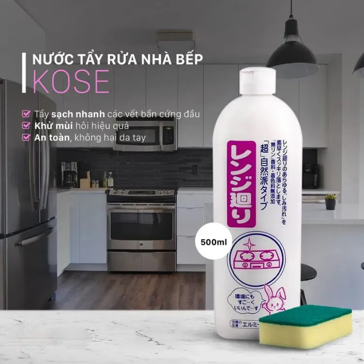 - Nước tẩy rửa nhà bếp cao cấp Kose giúp tẩy rửa các dụng cụ nhà bếp một cách nhanh chóng, kể cả các vết bẩn lâu ngày như: vết ố vàng bám vào đáy nồi, chảo, khay bếp gas, dầu mỡ bám trên bề mặt bếp gas, bếp tường...