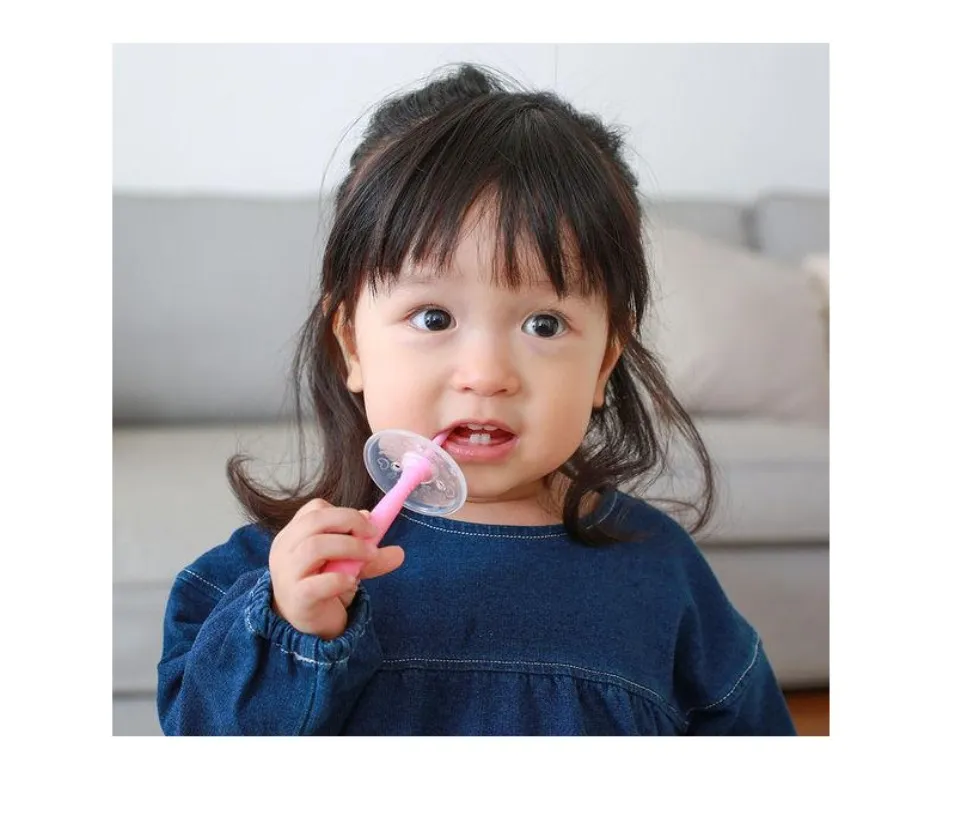 - Đầu bàn chải bằng cao su mềm đàn hồi nhẹ nhàng với nướu răng nhạy cảm của bé.