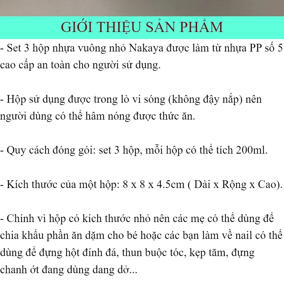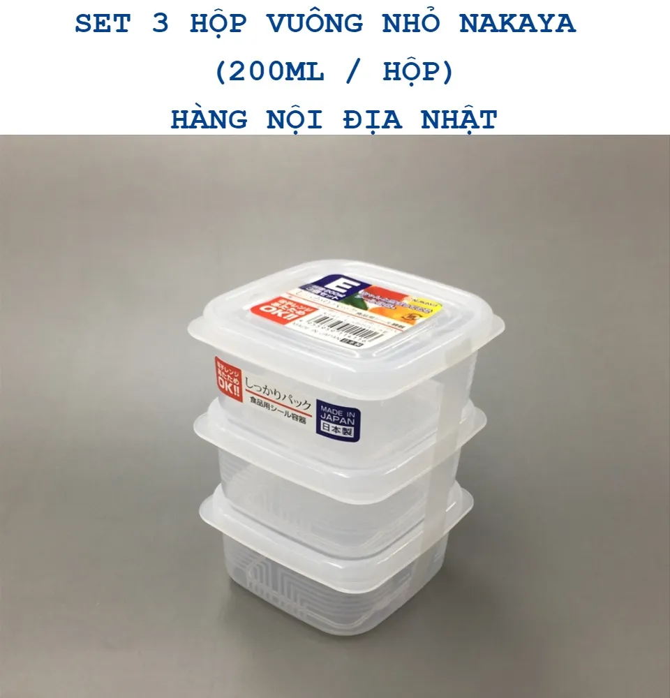 SET 3 HỘP VUÔNG NHỎ 200ML ĐỰNG THỰC PHẨM NAKAYA - HÀNG NỘI ĐỊA NHẬT, dùng được trong lò vi sóng, làm từ nhựa PP cao cấp