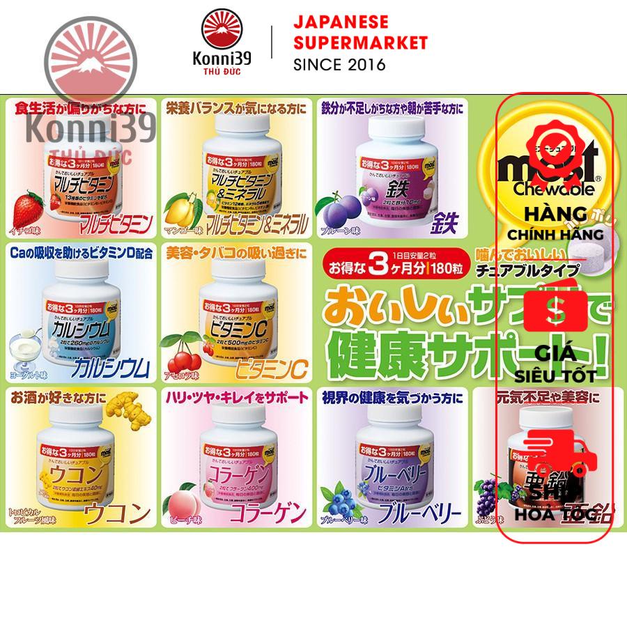 - Viên uống bổ sung Vitamin tổng hợp Orihiro vị dâu (lọ 180 viên - 2 viên/ ngày- dùng sau bữa ăn 30p): bổ sung Vitamin A, Vitamin B1, Vitamin B2, Vitamin B6, Vitamin B12, Niacin, Vitamin C, Vitamin D, Vitamin E, Vitamin K, axit folic, biotin, axit pantothenic. Giúp tăng cường sức đề kháng, bảo vệ cơ thể toàn diện, DÙNG CHO TRẺ 3 TUỔI TRỞ LÊN VÀ NGƯỜI LỚN.