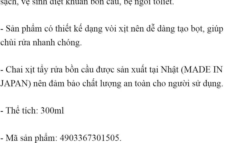 {"id":3672451,"name":"XỊT TẨY RỬA BỒN CẦU, NHÀ VỆ SINH ROCKET (CHAI 300ML) - HÀNG NỘI ĐỊA NHẬT","desc":"","content":"<h2 style=\"margin-left:0px;\">Mô tả sản phẩm<\/h2><figure class=\"image\"><img src=\"https:\/\/img.lazcdn.com\/g\/shop\/71ddfbc571fe8870d7ae81065f04484d.jpeg_2200x2200q80.jpg_.webp\"><\/figure><figure class=\"image\"><img src=\"https:\/\/img.lazcdn.com\/g\/shop\/364a31b9fe576c1f87eb02244b0d05c9.jpeg_2200x2200q80.jpg_.webp\"><\/figure><figure class=\"image\"><img src=\"https:\/\/img.lazcdn.com\/g\/shop\/094a85e1f0c837a5c9982904a727486a.jpeg_2200x2200q80.jpg_.webp\"><\/figure><figure class=\"image\"><img src=\"https:\/\/img.lazcdn.com\/g\/shop\/92a49ed0cb51012357ec1525d3c4402f.jpeg_2200x2200q80.jpg_.webp\"><\/figure><figure class=\"image\"><img src=\"https:\/\/img.lazcdn.com\/g\/shop\/e8f5299485ebc4cf7a26a3b31970debd.jpeg_2200x2200q80.jpg_.webp\"><\/figure><figure class=\"image\"><img src=\"https:\/\/img.lazcdn.com\/g\/shop\/a933fdb03c2863baa5fd05cf81b0f6fb.jpeg_2200x2200q80.jpg_.webp\"><\/figure><figure class=\"image\"><img src=\"https:\/\/img.lazcdn.com\/g\/shop\/96080bb2df469f460d793ca8e3b9bf42.jpeg_2200x2200q80.jpg_.webp\"><\/figure>","image_url":"https:\/\/konni39thuduc.com\/datafiles\/89665\/upload\/images\/shopee\/2026-04-14\/fc19bf76c8a8fdc005c9a991f861913c.jpg?t=1776147432","image_thumb_url":"https:\/\/konni39thuduc.com\/datafiles\/89665\/upload\/thumb_images\/shopee\/2026-04-14\/fc19bf76c8a8fdc005c9a991f861913c.jpg?t=1776151896","tags":[],"count_view":2,"seo_name":"xit-tay-rua-bon-cau-nha-ve-sinh-rocket-chai-300ml-hang-noi-dia-nhat","date_update":1776484743,"date_created_format":"","meta_title":"","meta_desc":"","meta_keyword":"","sku":"4903367301505","code":"4903367301505","rate":0,"image_2_url":"https:\/\/konni39thuduc.com\/datafiles\/89665\/upload\/images\/shopee\/2026-04-14\/445b843408d9148cb080723389486ea4.jpg","image_2_thumb_url":"https:\/\/konni39thuduc.com\/datafiles\/89665\/upload\/\/thumb_images\/shopee\/2026-04-14\/445b843408d9148cb080723389486ea4.jpg","time_promotion":false,"date_sale":[],"status_order":5,"variant_options":[],"variants":[{"status_inventory":1,"status_order":5,"id":891021,"product_id":3672451,"sku":"4903367301505","barcode":"","quantity":0,"quantity_alert":0,"price":49000,"price_discount":0,"images":[],"display_order":0,"is_point":"","point":"","vat":"","weight":"","variant_options":[],"variant_option_name":"","image":"","price_final":49000,"price_final_format":"49.000 đ","price_format":"49.000 đ","price_discount_format":"0 đ","percent_discount":0,"date_sale":[],"percent_discount_format":"- 0%","price_discount_final_format":"49.000 đ"}],"variantIdDefault":891021,"image_list":[{"image_url":"https:\/\/konni39thuduc.com\/datafiles\/89665\/upload\/images\/shopee\/2026-04-14\/fc19bf76c8a8fdc005c9a991f861913c.jpg","image_thumb_url":"https:\/\/konni39thuduc.com\/datafiles\/89665\/upload\/\/thumb_images\/shopee\/2026-04-14\/fc19bf76c8a8fdc005c9a991f861913c.jpg"},{"image_url":"https:\/\/konni39thuduc.com\/datafiles\/89665\/upload\/images\/shopee\/2026-04-14\/445b843408d9148cb080723389486ea4.jpg","image_thumb_url":"https:\/\/konni39thuduc.com\/datafiles\/89665\/upload\/\/thumb_images\/shopee\/2026-04-14\/445b843408d9148cb080723389486ea4.jpg"},{"image_url":"https:\/\/konni39thuduc.com\/datafiles\/89665\/upload\/images\/shopee\/2026-04-14\/efb6487a0f4426c0d07d5c19fa17ecc6.jpg","image_thumb_url":"https:\/\/konni39thuduc.com\/datafiles\/89665\/upload\/\/thumb_images\/shopee\/2026-04-14\/efb6487a0f4426c0d07d5c19fa17ecc6.jpg"},{"image_url":"https:\/\/konni39thuduc.com\/datafiles\/89665\/upload\/images\/shopee\/2026-04-14\/498feaf698e7d3a784305b20802c049f.jpg","image_thumb_url":"https:\/\/konni39thuduc.com\/datafiles\/89665\/upload\/\/thumb_images\/shopee\/2026-04-14\/498feaf698e7d3a784305b20802c049f.jpg"}],"product_articles":[],"total_point_review":0,"link_youtube":"https:\/\/www.youtube.com\/embed\/","video_url":"","booking_url":"javascript:void(0)","file_url":"","config_panorama":[],"brand_name":"NoBrand","qr_code":"https:\/\/konni39thuduc.com\/xit-tay-rua-bon-cau-nha-ve-sinh-rocket-chai-300ml-hang-noi-dia-nhat","promotion_name":"","status_inventory_value":1,"status_inventory":"Còn hàng","price":false,"price_final":"49.000 đ","percent_discount":false,"price_discount":false,"company_logo":"https:\/\/konni39thuduc.com\/datafiles\/89665\/upload\/files\/logo%20konni%20th%E1%BB%A7%20%C4%91%E1%BB%A9c.png","company_name":"KONNI39 THỦ ĐỨC","company_email":"konni39thuduc@gmail.com","company_phone":"","company_address":"","company_fax":"","date_now":1776494461,"company_tags":["HÀNG NHẬT \nKONNI 39\nKONNI39 THỦ ĐỨC"],"search_keyword":null,"facebook_comment":"https:\/\/konni39thuduc.com\/xit-tay-rua-bon-cau-nha-ve-sinh-rocket-chai-300ml-hang-noi-dia-nhat","breadscrumb":[{"url":"https:\/\/konni39thuduc.com","name":"Trang chủ","icon":"","active":false},{"url":"https:\/\/konni39thuduc.com\/san-pham","name":"Sản phẩm","icon":"","active":false},{"url":"https:\/\/konni39thuduc.com\/cham-soc-nha-cua","name":"CHĂM SÓC NHÀ CỬA","icon":"","active":true}],"list_products_tmp":[],"list_section":[{"id":736266,"name":"SECTION-71880","seo_name":"#w30s-section-736266","url":"#w30s-section-736266"},{"id":736270,"name":"SECTION-71881","seo_name":"#w30s-section-736270","url":"#w30s-section-736270"},{"id":736269,"name":"SECTION-82111","seo_name":"#w30s-section-736269","url":"#w30s-section-736269"},{"id":736284,"name":"SECTION-82310","seo_name":"#w30s-section-736284","url":"#w30s-section-736284"},{"id":736267,"name":"SECTION-71882","seo_name":"#w30s-section-736267","url":"#w30s-section-736267"},{"id":736271,"name":"SECTION-608142","seo_name":"#w30s-section-736271","url":"#w30s-section-736271"}],"type_page":4,"id_page":526247,"widget_16589787":{"content_data":{"content":"Ngôn ngữ"}},"widget_16589788":{"content_data":[{"id":128118,"title":"Viet Nam","code":"vn","is_expires":false,"is_active":1}]},"widget_16589820":{"content_