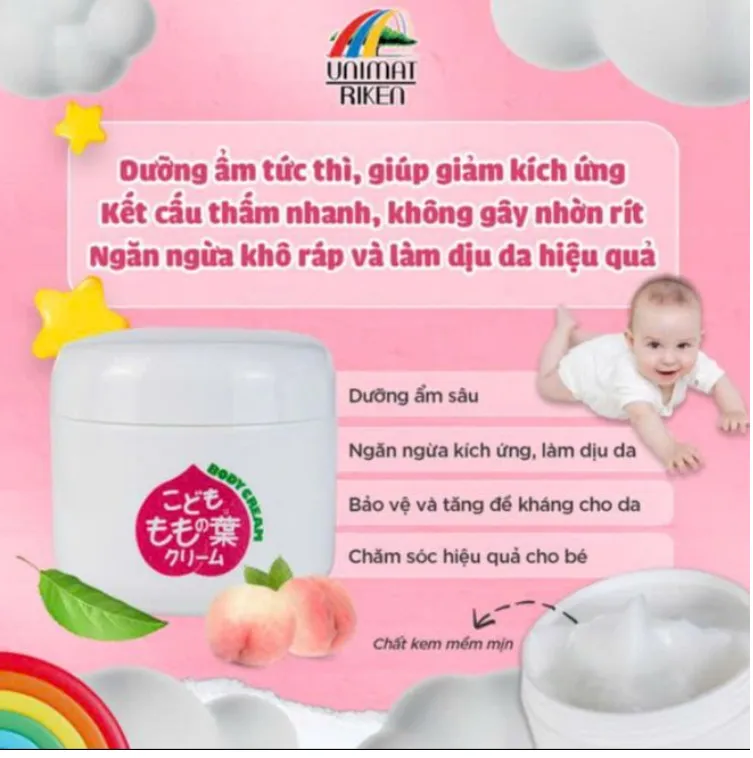 Kem dưỡng ẩm lá đào Unimat Riken là dòng kem dưỡng ẩm dùng được cho làn da nhạy cảm của trẻ sơ sinh và trẻ nhỏ với công dụng hỗ trợ dưỡng ẩm & hạn chế rôm sảy, hăm da cho bé.