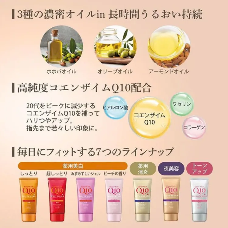 - Kem dưỡng da tay Q10 Kosé với thành phần Q10, chiết suất nhân sâm và chiết xuất thảo mộc tự nhiên sẽ thẩm thấu vào sâu trong da giúp hỗ trợ quá trình tái tạo tự nhiên của da, bổ sung dưỡng chất giúp dưỡng ẩm và làm mịn da.