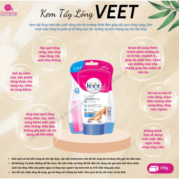- Kem tẩy lông Veet 150g dùng để tẩy lông vùng chân, tay, nách và bikini một cách nhẹ nhàng, không đau và cực kì dễ dàng. Hiệu quả ngay với cả những sợi lông rất rất ngắn nhé.