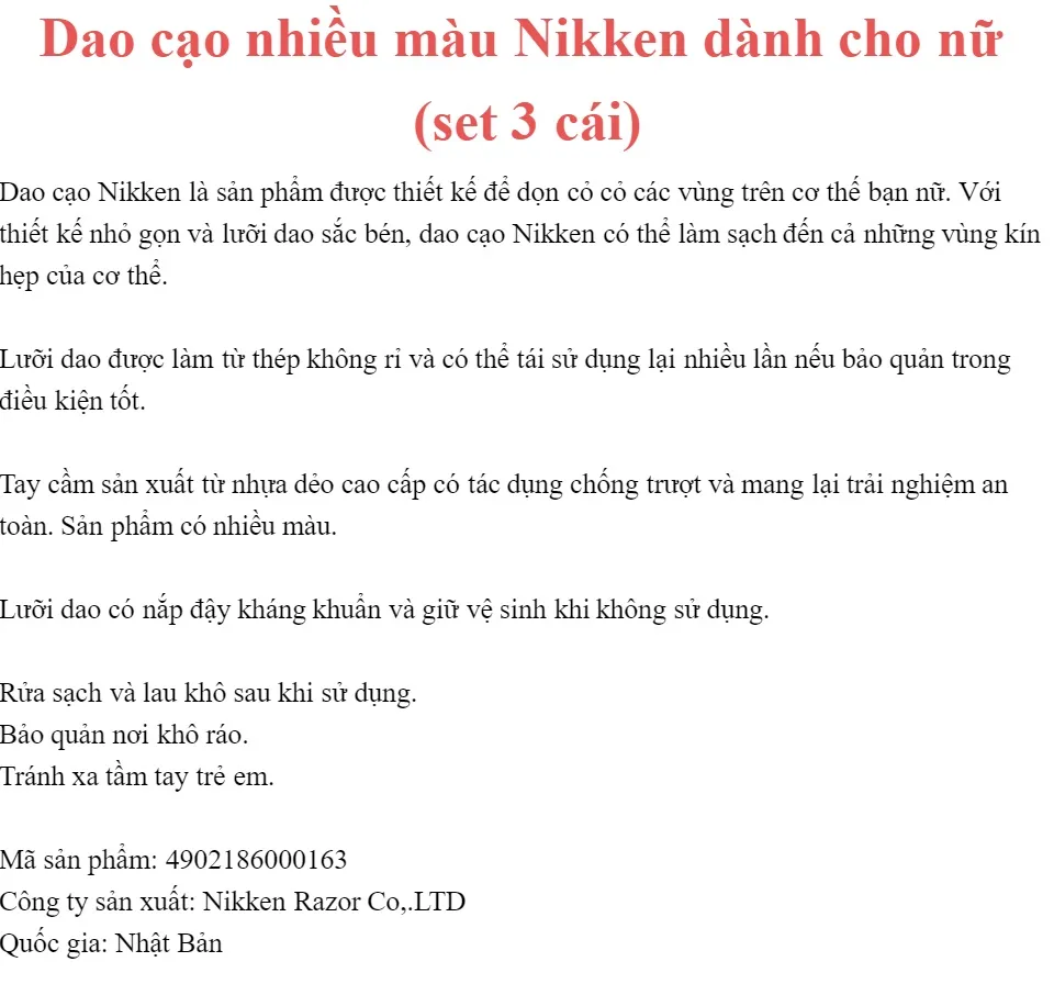 {"id":3672650,"name":"SET 3 DAO CẠO CHO NỮ - CÓ THỂ CẠO LÔNG MẶT","desc":"","content":"<h2 style=\"margin-left:0px;\">Mô tả sản phẩm<\/h2><figure class=\"image\"><img src=\"https:\/\/img.lazcdn.com\/g\/shop\/671cf6aed4ab0ed6dcaff6dea2dba807.jpeg_2200x2200q80.jpg_.webp\"><\/figure><figure class=\"image\"><img src=\"https:\/\/img.lazcdn.com\/g\/shop\/351f4584dac38520852c42e87bf9a528.jpeg_2200x2200q80.jpg_.webp\"><\/figure><figure class=\"image\"><img src=\"https:\/\/img.lazcdn.com\/g\/shop\/ef0a97f40be57b8a1654d0274aed3d50.jpeg_2200x2200q80.jpg_.webp\"><\/figure><figure class=\"image\"><img src=\"https:\/\/img.lazcdn.com\/g\/shop\/a00f4fb480b5cbdb9a438708c6412afa.jpeg_2200x2200q80.jpg_.webp\"><\/figure><figure class=\"image\"><img src=\"https:\/\/img.lazcdn.com\/g\/shop\/db19f0fcfd6f625d5d82eb35cfdfeba9.jpeg_2200x2200q80.jpg_.webp\"><\/figure><figure class=\"image\"><img src=\"https:\/\/img.lazcdn.com\/g\/shop\/f1dcc67b16149c7391087a5cefe23051.jpeg_2200x2200q80.jpg_.webp\"><\/figure><figure class=\"image\"><img src=\"https:\/\/img.lazcdn.com\/g\/shop\/22474d595f25872c492fb221c1734b0f.jpeg_2200x2200q80.jpg_.webp\"><\/figure><figure class=\"image\"><img src=\"https:\/\/img.lazcdn.com\/g\/shop\/1f4117798d3e926a5c8d6dc56695898d.jpeg_2200x2200q80.jpg_.webp\"><\/figure><figure class=\"image\"><img src=\"https:\/\/img.lazcdn.com\/g\/shop\/ba3b4e9948fcd2534d0c6d93b154eb24.jpeg_2200x2200q80.jpg_.webp\"><\/figure><figure class=\"image\"><img src=\"https:\/\/img.lazcdn.com\/g\/shop\/6622675b327478059680ef05d3676c27.jpeg_2200x2200q80.jpg_.webp\"><\/figure><figure class=\"image\"><img src=\"https:\/\/img.lazcdn.com\/g\/shop\/c968227d425b164032fe18f3b11f2793.jpeg_2200x2200q80.jpg_.webp\"><\/figure><figure class=\"image\"><img src=\"https:\/\/img.lazcdn.com\/g\/shop\/03379cc4e67087e058954f5576277a4d.jpeg_2200x2200q80.jpg_.webp\"><\/figure><figure class=\"image\"><img src=\"https:\/\/img.lazcdn.com\/g\/shop\/a344f7f9ea4dbb9ee377cccc08ec1f41.jpeg_2200x2200q80.jpg_.webp\"><\/figure><figure class=\"image\"><img src=\"https:\/\/img.lazcdn.com\/g\/shop\/6bc874edfb46bf126ef3f2bca124594f.jpeg_2200x2200q80.jpg_.webp\"><\/figure><p style=\"margin-left:0px;\"> <\/p><p><br> <\/p>","image_url":"https:\/\/www.konni39thuduc.com\/datafiles\/89665\/upload\/images\/shopee\/2026-04-14\/d10d0caef057dd4a357689aa86cc2920.jpg?t=1776148749","image_thumb_url":"https:\/\/www.konni39thuduc.com\/datafiles\/89665\/upload\/thumb_images\/shopee\/2026-04-14\/d10d0caef057dd4a357689aa86cc2920.jpg?t=1776152314","tags":[],"count_view":2,"seo_name":"set-3-dao-cao-cho-nu-co-the-cao-long-mat","date_update":1777019659,"date_created_format":"","meta_title":"","meta_desc":"","meta_keyword":"","sku":"4902186000163","code":"4902186000163","rate":0,"image_2_url":"https:\/\/www.konni39thuduc.com\/datafiles\/89665\/upload\/images\/shopee\/2026-04-14\/0c24ecb617f16301eed4a4894ee0edce.jpg","image_2_thumb_url":"https:\/\/www.konni39thuduc.com\/datafiles\/89665\/upload\/\/thumb_images\/shopee\/2026-04-14\/0c24ecb617f16301eed4a4894ee0edce.jpg","time_promotion":false,"date_sale":[],"status_order":5,"variant_options":[],"variants":[{"status_inventory":1,"status_order":5,"id":891307,"product_id":3672650,"sku":"4902186000163","barcode":"","quantity":0,"quantity_alert":0,"price":39000,"price_discount":0,"images":[],"display_order":0,"is_point":"","point":"","vat":"","weight":"","variant_options":[],"variant_option_name":"","image":"","price_final":39000,"price_final_format":"39.000 đ","price_format":"39.000 đ","price_discount_format":"0 đ","percent_discount":0,"date_sale":[],"percent_discount_format":"- 0%","price_discount_final_format":"39.000 đ"}],"variantIdDefault":891307,"image_list":[{"image_url":"https:\/\/www.konni39thuduc.com\/datafiles\/89665\/upload\/images\/shopee\/2026-04-14\/d10d0caef057dd4a357689aa86cc2920.jpg","image_thumb_url":"https:\/\/www.konni39thuduc.com\/datafiles\/89665\/upload\/\/thumb_images\/shopee\/2026-04-14\/d10d0caef057dd4a357689aa86cc2920.jpg"},{"image_url":"https:\/\/www.konni39thuduc.com\/datafiles\/89665\/upload\/images\/shopee\/2026-04-14\/0c24ecb617f16301eed4a4894ee0edce.jpg","image_thumb_url":"https:\/\/www.konni39thuduc.com\/datafiles\/89665\/upload\/\/thumb_images\/shopee\/2026-04-14\/0c24ecb617f16301eed4a4894ee0edce.jpg"},{"image_url":"https:\/\/www.konni39thuduc.com\/datafiles\/89665\/upload\/images\/shopee\/2026-04-14\/c0fee3c0d18c261e7eece541378d530a.jpg","image_thumb_url":"https:\/\/www.konni39thuduc.com\/datafiles\/89665\/upload\/\/thumb_images\/shopee\/2026-04-14\/c0fee3c0d18c261e7eece541378d530a.jpg"},{"image_url":"https:\/\/www.konni39thuduc.com\/datafiles\/89665\/upload\/images\/shopee\/2026-04-14\/4af6d507404b5443f1c339084e98b5e0.jpg","image_thumb_url":"https:\/\/www.konni39thuduc.com\/datafiles\/89665\/upload\/\/thumb_images\/shopee\/2026-04-14\/4af6d507404b5443f1c339084e98b5e0.jpg"},{"image_url":"https:\/\/www.konni39thuduc.com\/datafiles\/89665\/upload\/images\/shopee\/2026-04-14\/797e01d72335f3d9e99f314b2cae6dcb.jpg","image_thumb_url":"https:\/\/www.konni39thuduc.com\/datafiles\/89665\/upload\/\/thumb_images\/shopee\/2026-04-14\/797e01d72335f3d9e99f314b2cae6dcb.jpg"},{"image_url":"https:\/\/www.konni39thuduc.com\/datafiles\/89665\/upload\/images\/shopee\/2026-04-14\/2fdecb825a183fecd6978db1995b3b96.jpg","image_thumb_url":"https:\/\/www.konni39thuduc.com\/datafiles\/89665\/upload\/\/thumb_images\/shopee\/2026-04-14\/2fdecb825a183fecd6978db1995b3b96.jpg"}],"product_articles":[],"total_point_review":0,"link_youtube":"https:\/\/www.youtube.com\/embed\/","video_url":"","booking_url":"javascript:void(0)","file_url":"","config_panorama":[],"brand_name":"NoBrand","qr_code":"https:\/\/www.konni39thuduc.com\/set-3-dao-cao-cho-nu-co-the-cao-long-mat","promotion_name":"","status_inventory_value":1,"status_inventory":"Còn hàng","price":false,"price_final":"39.000 đ","percent_discount":false,"price_discount":false,"company_logo":"https:\/\/www.konni39thuduc.com\/datafiles\/89665\/upload\/files\/